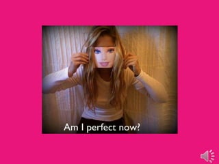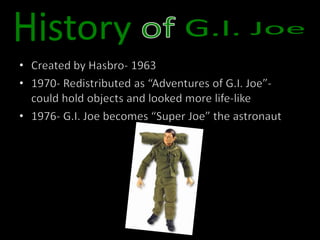 The document discusses studies that show how Barbie dolls and G.I. Joe action figures can negatively impact body image in children. The "Body Project" study found that Barbie promotes unattainable beauty standards for girls and the idea that outward appearance is more important than personality. Similarly, G.I. Joe can lead boys to believe that masculinity means being extremely muscular and associated with violence and dominance. Both toys may increase risks of eating disorders, steroid use, and other body image issues.