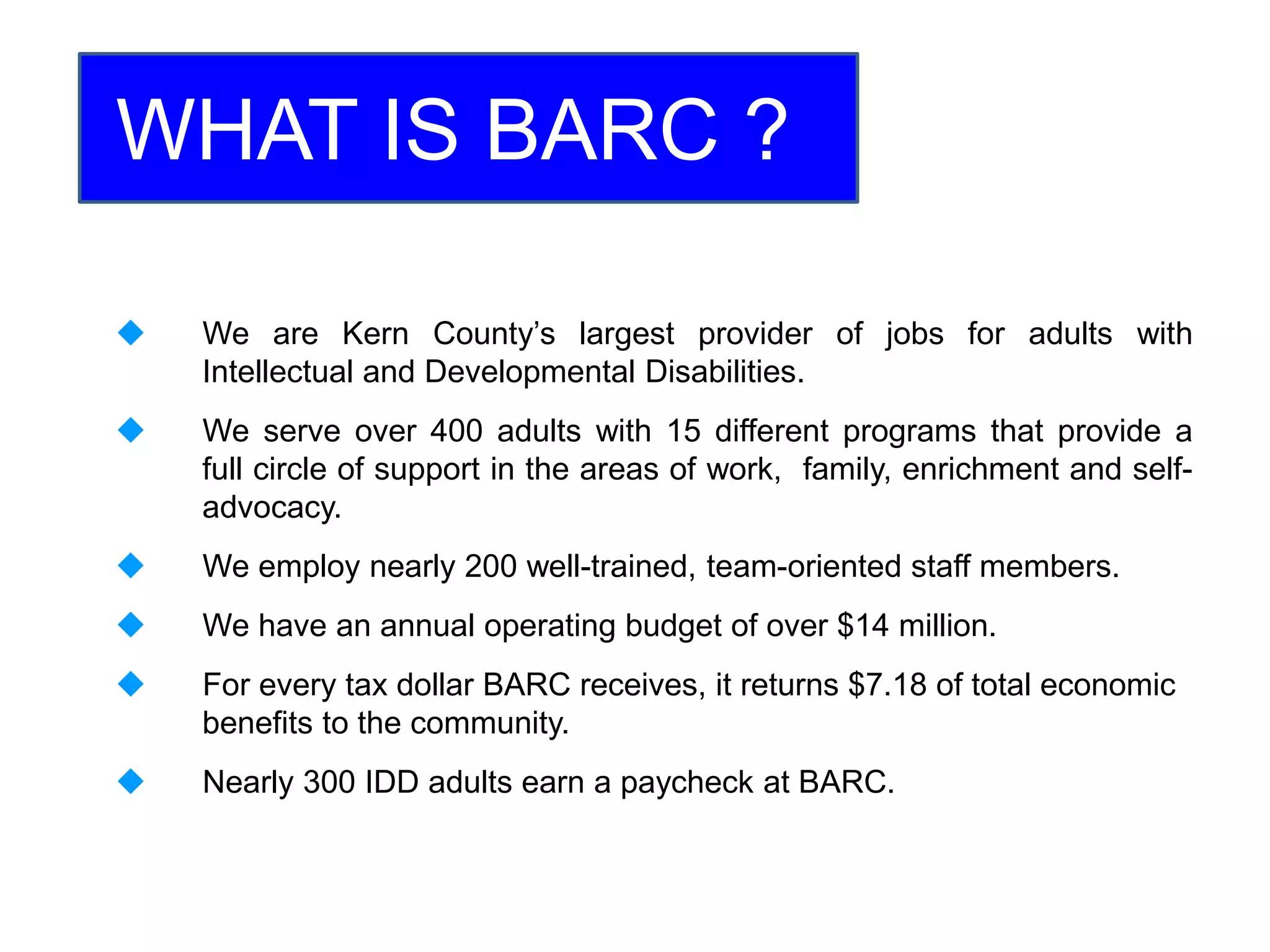 This document provides information about BARC, an organization in Kern County, California that employs adults with intellectual and developmental disabilities. BARC has over 400 clients in 15 programs, nearly 200 employees, an annual budget over $14 million. BARC's industries include recycling, e-waste processing, a shop, document destruction, and more. BARC recycles over 4.5 million pounds of material per month, diverting it from landfills. BARC provides jobs and services to help adults with disabilities.