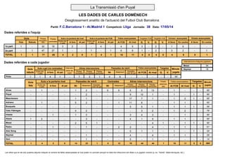 Puyal LES DADES DE CARLES DOMÈNECH Dades referides a l'equip Pilotes recupera- des Pilotes perdudes Xuts a la porteria del FCB A fora Al pal Gols Fets Rebuts Faltes assenyalades Al rival 1a part 2a part Targetes FCB G. V. Targetes rival G. V. Córners assenyalats Orsais assenyalats TOTAL En contraA favorEn contraA favor 1 1 4577 1 4 1 8411 104 40 0 Entre els 3 pals 4 2 0 Al palA foraEntre els 3 pals Xuts a la porteria del rival Al FCB 10 1 - - 1 18 2747 30 - 1 4 1 3 - 1 - - 2 - - 4 6 5 6 3 - 1 - 2 2 - - 6 2 - 13 - -1 Desglossament analític de l'actuació del Futbol Club Barcelona Partit: F.C.Barcelona 1 - At.Madrid 1 Competició: Lliga Jornada: 38 Data: 17/05/14 Faltes assenyalades Al FCB Targetes G. V. Minuts jugatsAl rival Gols rebuts Xuts a gol (no centrades) Entre els 3 pals A fora Al pal Interven- cions de mèrit Altres intervencions Pilotes blocades Pilotes rebutjades Pilotes perdudes Passades de mèrit Bé Malament Assistèn- cies de gol Pinto 90'- - - -1 141 - 7 3 1 4 6 - Intervencions d'alguns jugadors Messi 54 Neymar 18 Dades referides a cada jugador Passades de mèrit Bé Malament Assistèn- cies de gol Orsais assenya- lats Faltes assenyalades Targetes G. V. Minuts jugatsAl FCB Al rival Gols fets Al palA foraEntre els 3 pals Xuts a la porteria rival MalamentBé Centrades Altres intervencions Pilotes recuperades Pilotes rebutjades Pilotes perdudes Alves 90'- 1 --5 - -- 1 - - 1 2 5 9 135 Piqué 90'- 1 --10 1 -- - - - - 2 - - 19 Mascherano 90'- 1 2-7 1 -- - - - 1 1 - - 117 Adriano 90'- 1 1-8 - -- 1 - - 5 2 - 1 -11 Busquets 56'- 1 1-5 1 -- - - - - - - - 15 Cesc Fàbregas 76'- 1 2-3 - -- - - - 4 2 - - 2- Iniesta 90'- - 1-4 - -- - 1 - 1 3 - - 33 Alexis 90'- 1 1-1 - -1 2 - - - 3 - - 94 Messi 90'1 - 11- 1 -- - - - 2 5 - - 4- Pedro 61'- 1 1-- - -- - 1 - - 1 - 2 42 Alex Song 34'- 1 --1 1 -- - - - - - - - 15 Neymar 29'- 1 1-- - -- - - - - 1 - - 44 Xavi 14'- - --- - -- - - - - 1 - - 15 TOTAL 1 44 1 5 010 900'111 4 2 0 2314 125 4470 Les xifres que en els dos quadres adjunts indiquen el nombre de faltes assenyalades al rival poden no coincidir perquè no totes les infraccions són fetes a un jugador contrari (p. ex. "hands", faltes tècniques, etc.)