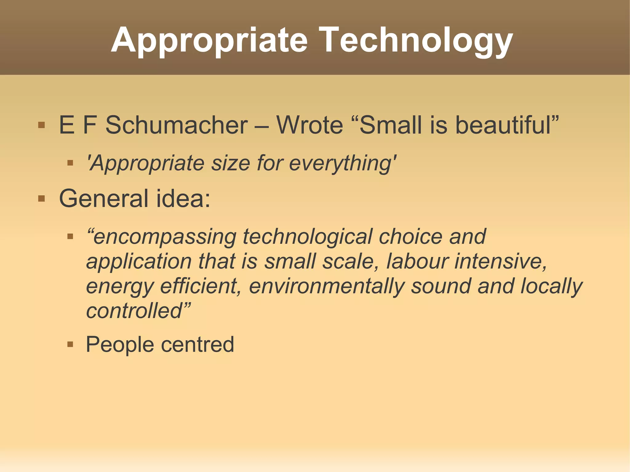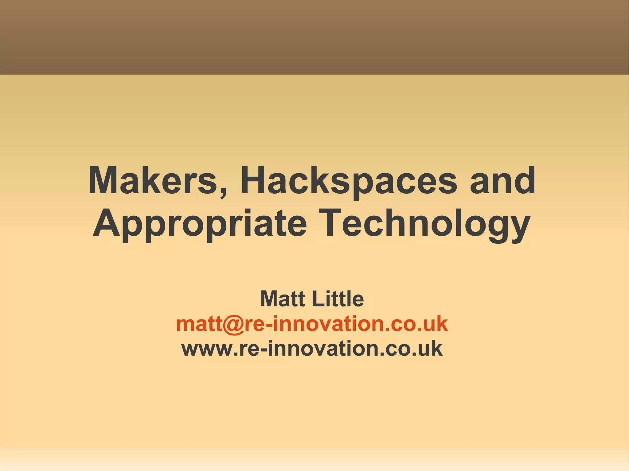 This document discusses appropriate technology and how makerspaces and hackspaces can help advance it. Appropriate technology focuses on small-scale, labour-intensive, energy-efficient, and locally-controlled solutions. It remains relevant given many lack access to resources. The document outlines benefits of access to energy and issues that can arise. It provides examples of appropriate technology projects and discusses how makerspaces could introduce local production, share knowledge, and help test and fund new ideas to better connect problems to solutions.