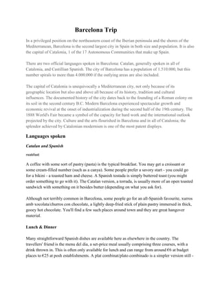 The document provides details about a trip to Barcelona, Spain including transportation costs, hotel accommodations, meals, and activities. A flight from India to Barcelona costs Rs. 36,012. Hotel Neuvo Triunfo costs €428 for 7 nights. Car rental including fuel will be £91.02 for 7 days. Key museums to visit include Fundació Miró (€5 entry), Palau de la Música Catalana (€4.21 entry), and Park de la Ciudadella (€3 entry). The total estimated cost of the trip is Rs. 75,928.