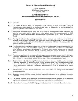 This document outlines the regulations for the B.Arch curriculum and syllabus for students admitted from the 2011-2012 academic year at SRM University. It details the admission requirements, program structure, course requirements, registration process, attendance policies, and assessment procedures for the B.Arch degree program. The program is designed to last 10 semesters and awards 220 credits upon completion, with courses in various subject areas including design studios, building materials, structures, and professional training. Students must maintain a minimum attendance of 75% in each course and earn a specified minimum number of credits each year to be eligible to continue in the program.