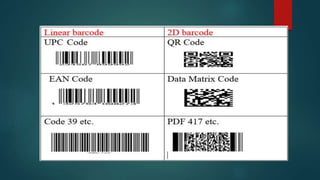 The document discusses barcode technology and QR codes. It defines a barcode as a predefined format of dark and white spaces that can contain specific information to allow real-time data collection. There are two main types of barcodes: linear and 2D barcodes. QR codes are a type of 2D barcode that can store more information and be read quickly by camera devices. Barcodes and QR codes provide benefits like cost efficiency, accuracy, and linking digital and physical items, but have disadvantages like requiring coding of data and system reliance.