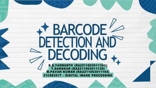 The document discusses a mini project focused on developing an efficient barcode detection and decoding system using OpenCV and ZBar, aiming to automate barcode identification in real-time and static images. It addresses challenges in accurately detecting various barcode formats under different conditions and outlines a comprehensive project scope, including real-time detection and robust image preprocessing. The system results demonstrate high accuracy and efficiency, making it versatile for applications such as inventory management and point-of-sale systems.