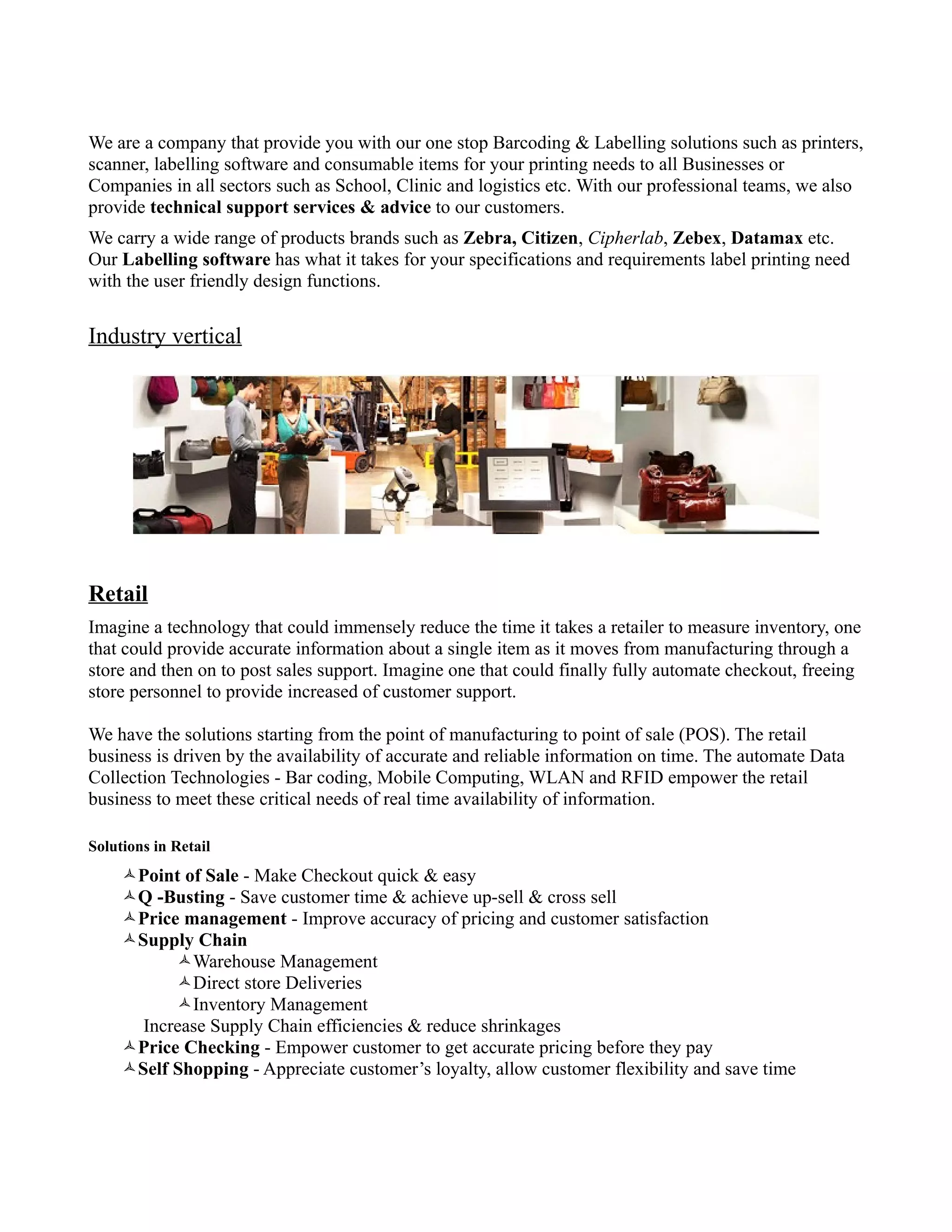 This document provides an overview of barcode and labelling solutions offered by a company. They offer products like printers, scanners, labelling software and consumables for various industries including retail, logistics, automotive, FMCG, pharmaceuticals, and healthcare. They also provide services like technical support, system integration, software development and enterprise mobility/WLAN solutions to help customers implement barcode and RFID technologies. The document discusses the benefits of these solutions for inventory management, supply chain visibility, reducing errors and improving efficiency.