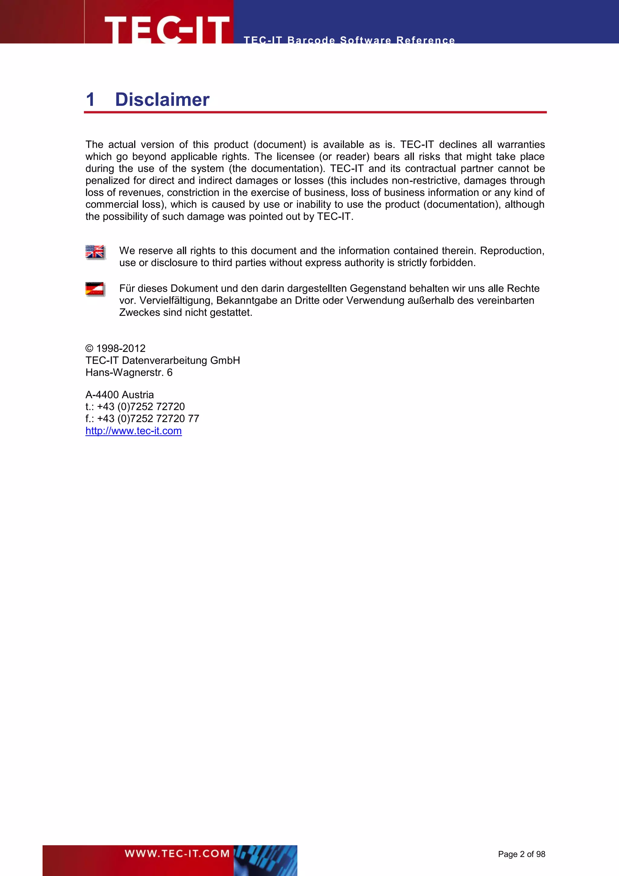 This document provides an overview and reference for TEC-IT barcode software. It discusses different types of barcodes, including linear 1D barcodes and 2D barcodes. It describes important barcode parameters such as barcode symbology, module width, bar width reduction, quiet zone, print ratio, format, escape sequences, and check digits. Application identifiers are explained with examples. The document also provides details on various 1D and 2D barcode symbologies. It serves as a manual for users of TEC-IT barcode software.