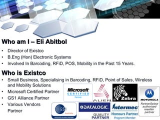This document provides an overview of barcodes, RFID, and supply chain management from a presentation given by Existco. It discusses the basics of barcodes and RFID, including common standards like GS1-128. It then describes how barcodes and RFID can be used at various stages of the supply chain, including receiving goods, picking, palletizing, shipping, receiving at sites, and replenishment requests. The presentation recommends using both barcodes and RFID to track items cost effectively through the supply chain. It also provides hardware and software recommendations to help implement an effective supply chain tracking system.