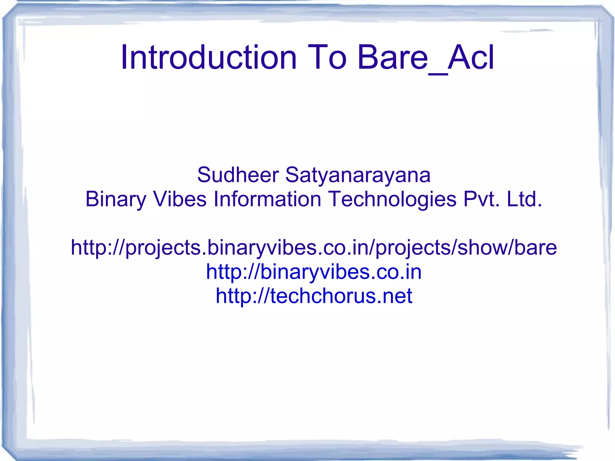 This document introduces Bare_Acl, an access control list component of the Bare PHP framework. It was created to simplify access control and works with common PHP autoloaders. The document demonstrates how to define privileges, roles, and rules to control access and use assertions to customize access checks. Contributions to Bare are welcome under an open source license.