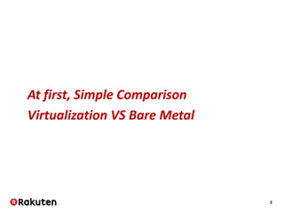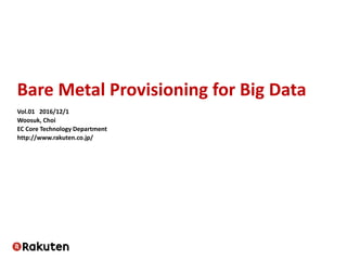 The document discusses bare metal provisioning for big data, emphasizing its advantages over virtualization in terms of performance and cost. It outlines hardware selection, system architecture, and the management processes involved in provisioning physical servers. The author also highlights the need for automation and self-service capabilities in managing resources efficiently within the infrastructure.