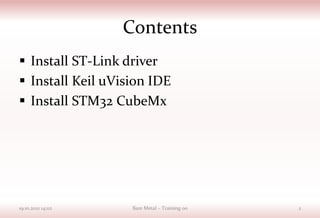 This document provides instructions for installing software prerequisites for a bare metal embedded training using a GlobalLogic starter kit. The instructions include downloading and installing: 1) An ST-Link driver to interface with the board; 2) Keil uVision IDE for embedded development; and 3) STM32 CubeMx for configuration. Completing these steps prepares the hardware and software for the trainings by setting up the development environment and debugger connection to the board.