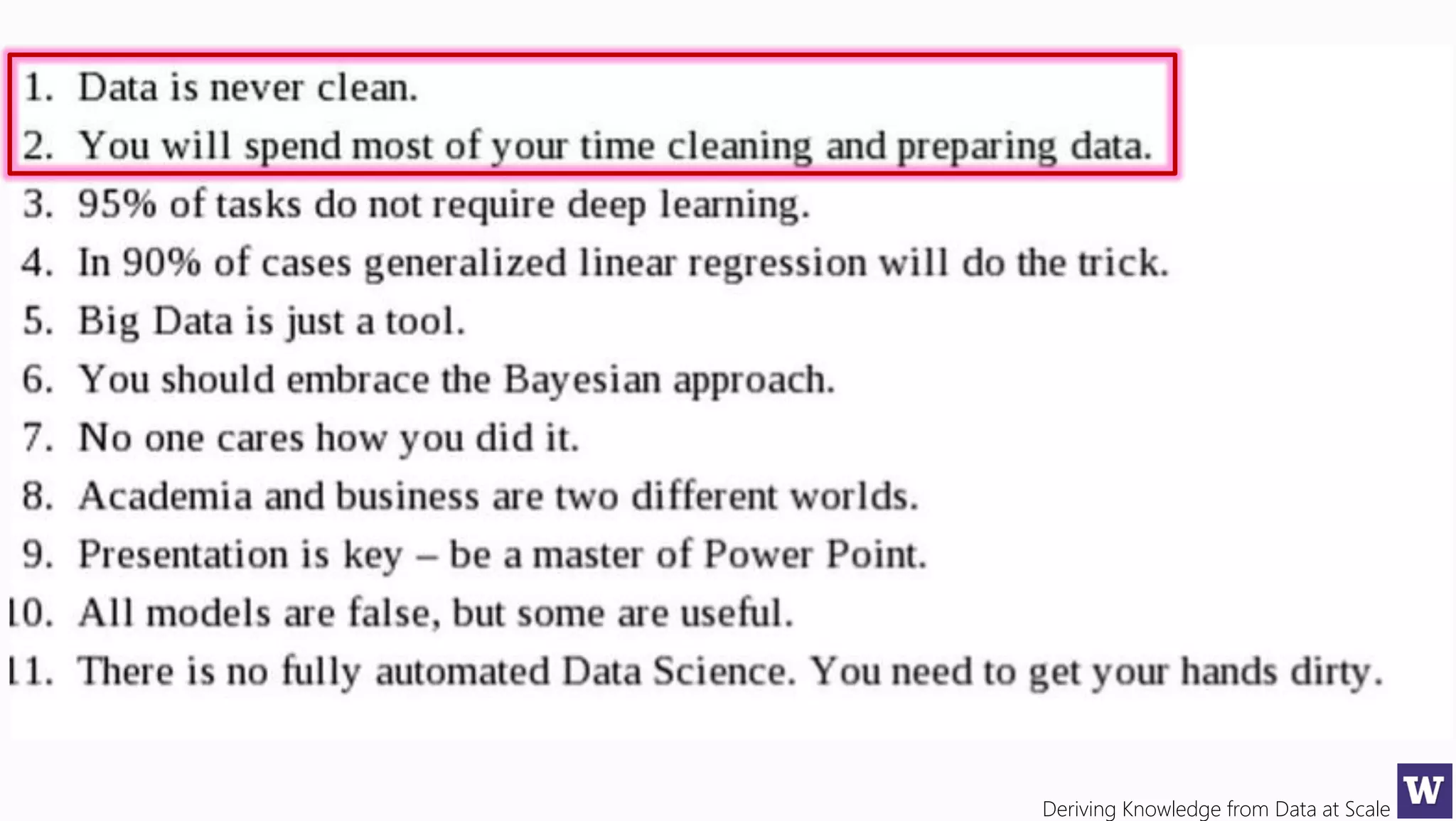 This document appears to be lecture slides for a course on deriving knowledge from data at scale. It covers many topics related to building machine learning models including data preparation, feature selection, classification algorithms like decision trees and support vector machines, and model evaluation. It provides examples applying these techniques to a Titanic passenger dataset to predict survival. It emphasizes the importance of data wrangling and discusses various feature selection methods.