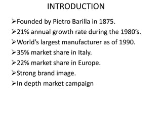Barilla Spa is the world's largest pasta manufacturer founded in 1875 in Italy. It had a strong brand image and 21% annual growth in the 1980s, achieving a 35% market share in Italy and 22% in Europe by 1990. However, it was facing increasing operational inefficiencies and cost penalties due to large weekly variations in distributor order patterns, known as the bullwhip effect, which is amplified demand variation that moves up the supply chain. Implementing a Just-in-Time distribution model was proposed to help Barilla better forecast and deliver the appropriate product quantities on schedule to meet demand more efficiently while decreasing costs.