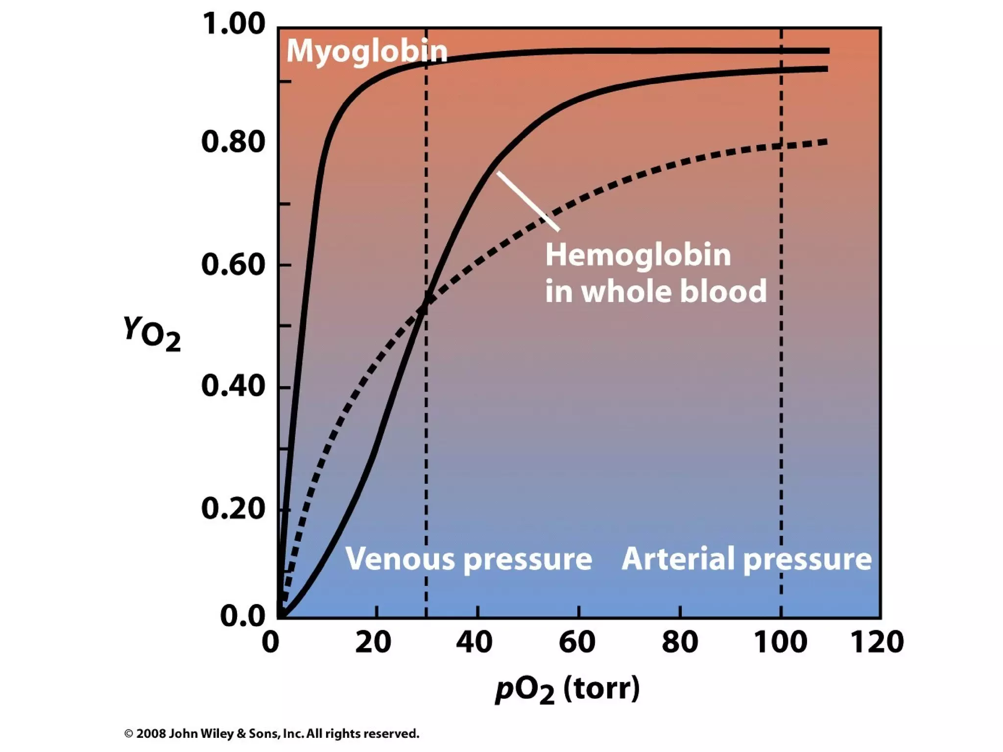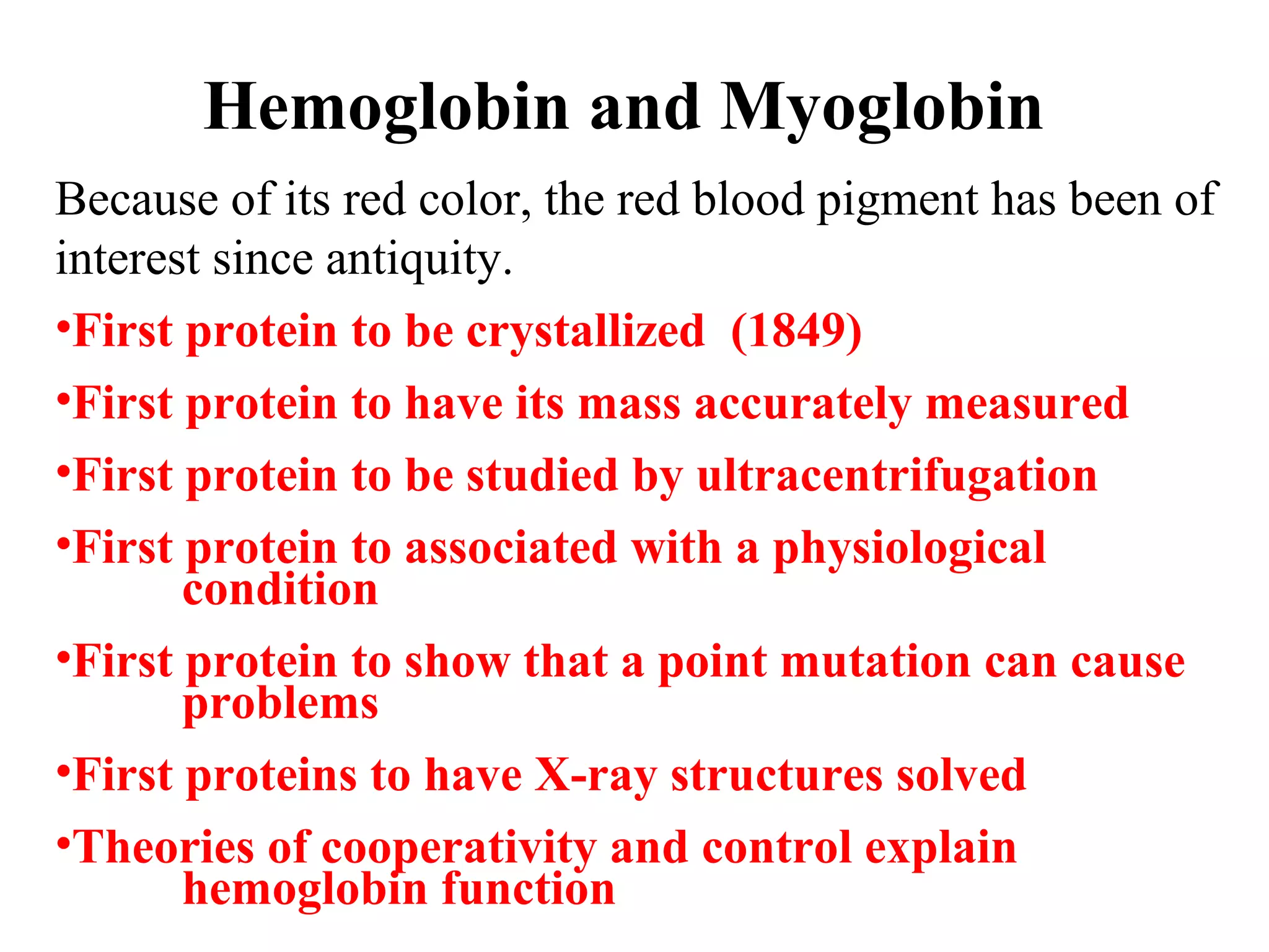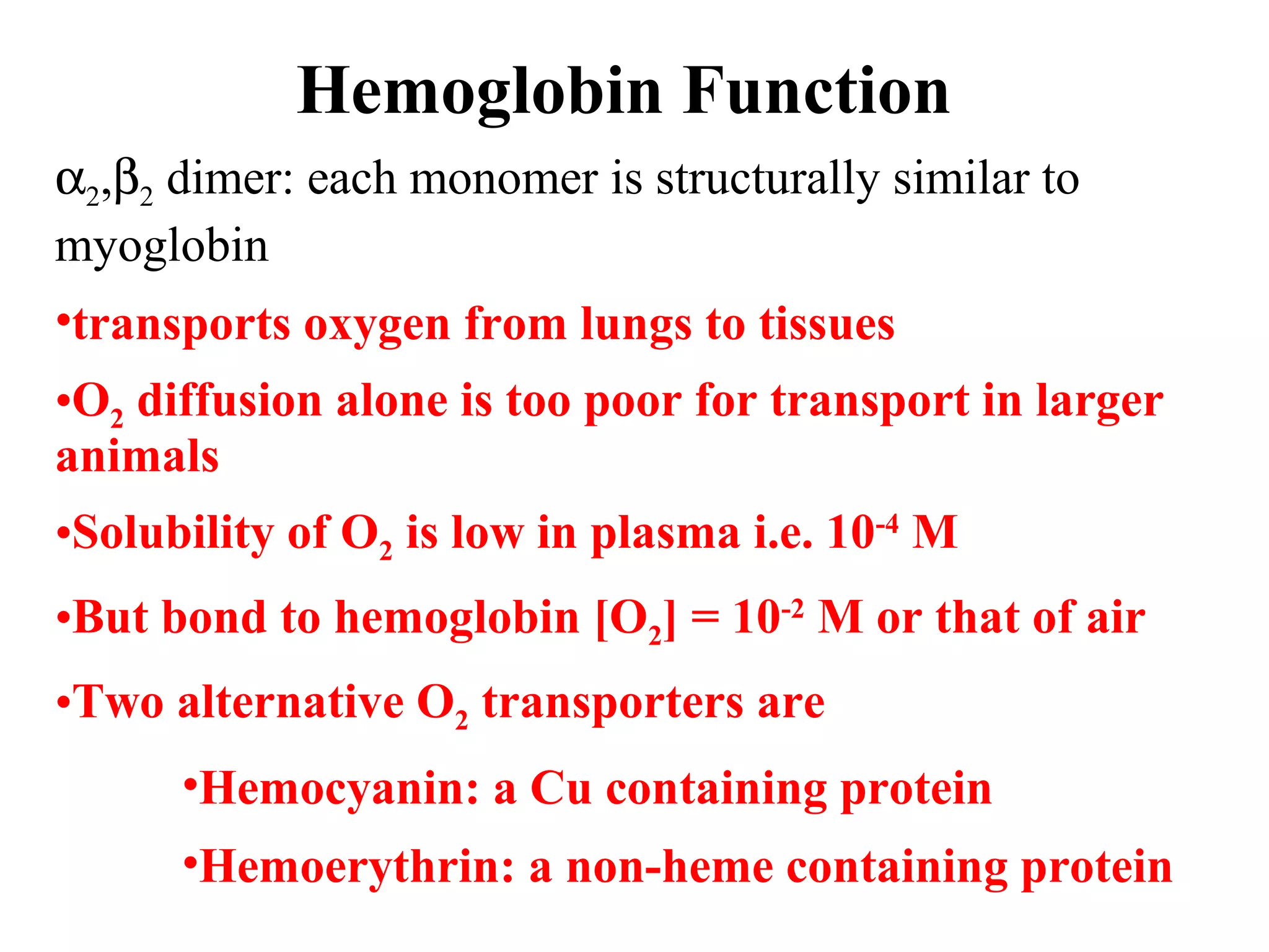 Hemoglobin and myoglobin are heme proteins that bind oxygen. Hemoglobin transports oxygen from the lungs to tissues, while myoglobin stores and facilitates oxygen diffusion in muscle tissue. Hemoglobin binds oxygen cooperatively through interactions between its subunits, allowing it to fully saturate with oxygen in the lungs but release 40% of its oxygen at lower oxygen tensions in the veins. Myoglobin binds oxygen noncooperatively. The binding affinity of both proteins is decreased by factors like protons (Bohr effect), carbon dioxide, and BPG, enhancing oxygen release to tissues. These properties allow hemoglobin and myoglobin to optimize oxygen delivery and storage in mammals.
