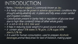 The document discusses barley (Hordeum vulgare L.), a hardy crop suitable for diverse climatic conditions and rich in nutrients like carbohydrates, vitamins, and proteins. It elaborates on barley cultivation, including optimal sowing times, soil requirements, and various techniques for irrigation, pest, and weed management, as well as its uses in human consumption and animal feed. Additionally, it highlights barley varieties, their resistance to diseases, and essential agricultural practices for successful cultivation.