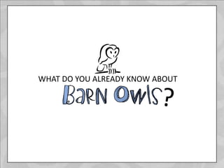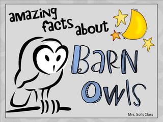 This document provides information about barn owls in 3 paragraphs. It discusses that barn owls like to live in barns and other man-made structures and can be found on every continent except Antarctica. It notes that barn owls are nocturnal birds of prey that hunt using excellent hearing. It provides some key facts about barn owls, such as that they have a 42 inch wingspan, lay 3-10 eggs, and only live about 2 years in the wild.