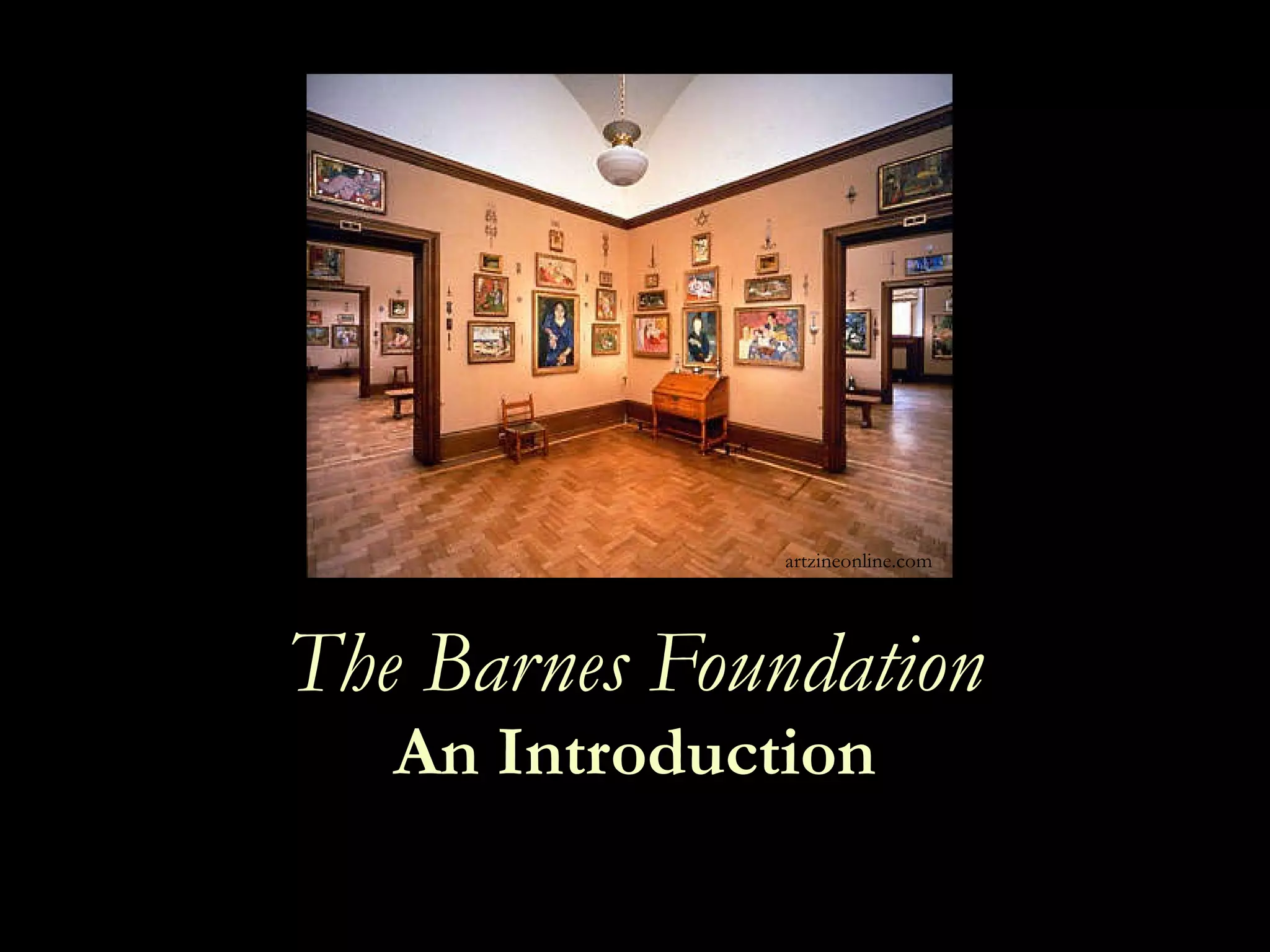 The document provides background information on the Barnes Foundation, an art collection established in 1922 through an indenture of trust by Dr. Albert C. Barnes who studied medicine, chemistry, and pharmacology. Over time, the foundation faced litigation and controversies over amending the terms of Barnes' indenture of trust to allow more public access and a move to a new building in order to address financial issues as the original operating funds were depleted.