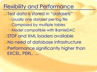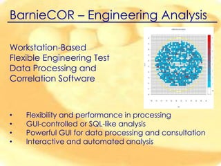 BarnieCOR is engineering analysis software that provides flexibility and high performance for processing test data without needing a database infrastructure. It offers both basic and advanced tools through its GUI. The GUI allows for interactive data processing by showing source data and query results in windows, and generating customizable plots from the results. Analysis can also be automated through scripts that implement processing functions, and data can be shared with other software for further post-processing.