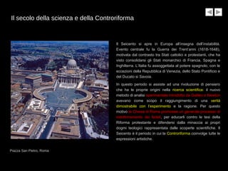 Il Seicento, periodo di instabilità in Europa segnato dalla Guerra dei Trent'anni, vide la Chiesa Cattolica adottare l'arte barocca per propagandare le proprie dottrine e contrastare la Riforma Protestante. Galileo Galilei, figura centrale della rivoluzione scientifica, fu perseguitato per le sue scoperte astronomiche e costretto all'abiura. L'architettura barocca si distinse per la grandiosità e il dinamismo, cercando di stupire e coinvolgere il fedele attraverso un'arte che fondava insieme pittura, scultura e architettura.