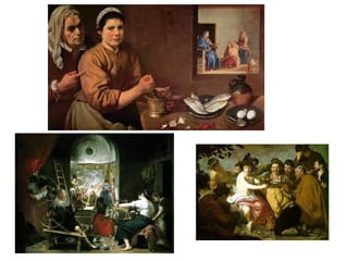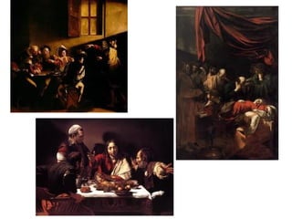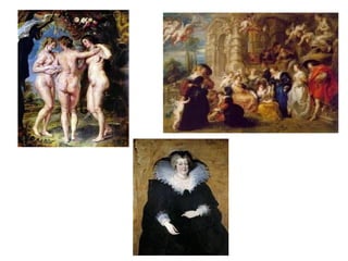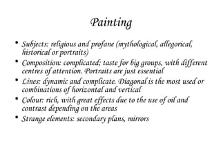 Baroque painting is characterized by complicated compositions with different centers of attention, dynamic and complicated lines often using diagonals, and rich colors designed to create dramatic effects. Major Baroque painters include Caravaggio who used strong contrasts of light, Carracci who combined naturalism with idealization, Rubens who achieved balance between realism and idealism, Rembrandt with his mastery of light and shadow, and Velazquez who gave equal importance to subjects from royal portraits to everyday scenes. Rococo painting featured sensual beauty and depictions of high society, with Watteau, Fragonard, and Tiepolo portraying elegant figures in vibrant colors.