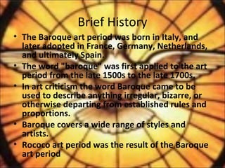 The document provides an overview of the Baroque period in art from 1600-1750. It discusses the origins and characteristics of Baroque art, noting three main tendencies: religious tensions in Christianity, the rise of absolute monarchies and middle class, and new interests in science and nature. The Baroque period saw developments in painting, sculpture, architecture, music, literature and other mediums. Important artists of the period included Caravaggio, Bernini, Velazquez, Zurbaran, van Dyck, Rubens, and Vermeer. Their works reflected the dramatic and emotional styles that came to define Baroque art.