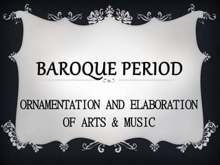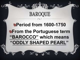 The document provides an overview of the Baroque period in arts and music from 1600-1750. It describes the ornate and elaborate characteristics of Baroque architecture, painting, and music. Some key points include: Baroque music had elements of unity, continuity, and terraced dynamics; important vocal forms that emerged were opera, cantata, and oratorio; and influential Baroque composers mentioned were Monteverdi, Handel, Bach, and Vivaldi.