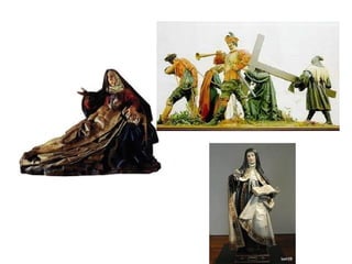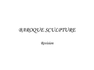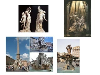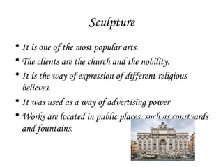 Baroque sculpture was often commissioned by the church and nobility for public spaces like courtyards and fountains. It had characteristics like complicated diagonal lines, dramatic lighting effects, and grand gestures. Famous sculptors included Bernini in Italy, known for capturing motion in stone, Girardon in France who worked for Louis XIV, and Gregorio Fernandez in Spain, renowned for his realistic depictions of human anatomy and emotion in religious works. Rococo sculpture became more decorative and emphasized technical skill, with allegorical works and portraits of great men placed in gardens and parks.