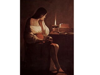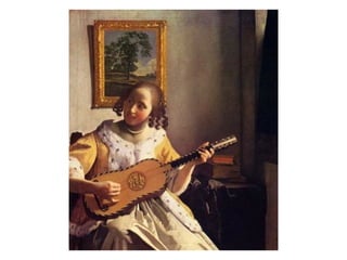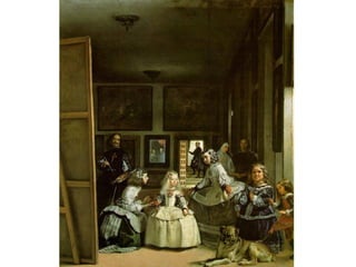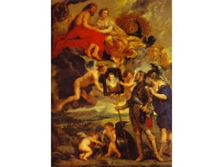 This document provides information on several Baroque artworks including paintings, frescoes, and architectural details. It lists the titles, artists, and dates of works such as Artemisia Gentileschi's Judith Slaying Holofernes, Pietro da Cortona's Glorification of the Reign of Urban VIII, Peter Paul Rubens' Arrival of Marie de' Medici at Marseilles, and Rembrandt's Self Portrait at Age 63 among others. The document also mentions architectural techniques like foreshortening and frescoes that appear to remove ceilings.