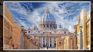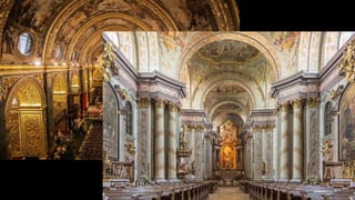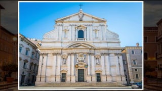 Baroque architecture originated in the late 16th century and is characterized by dramatic lighting, colorful interiors, intricate sculptures, and unfinished elements. There were three phases - Early Baroque from 1584-1625, High Baroque from 1625-1675, and Late Baroque from 1675-1750. Some iconic examples include St. Peter's Basilica in Vatican City designed by Gian Lorenzo Bernini, San Carlo Alle Quattro Fontane in Rome designed by Francesco Borromini, the Palace of Versailles designed for King Louis XIV, and the Trevi Fountain in Rome designed by Nicola Salvi and Giuseppe Pannini. Baroque architecture spread across Europe and was aimed at creating a sense of dramatic