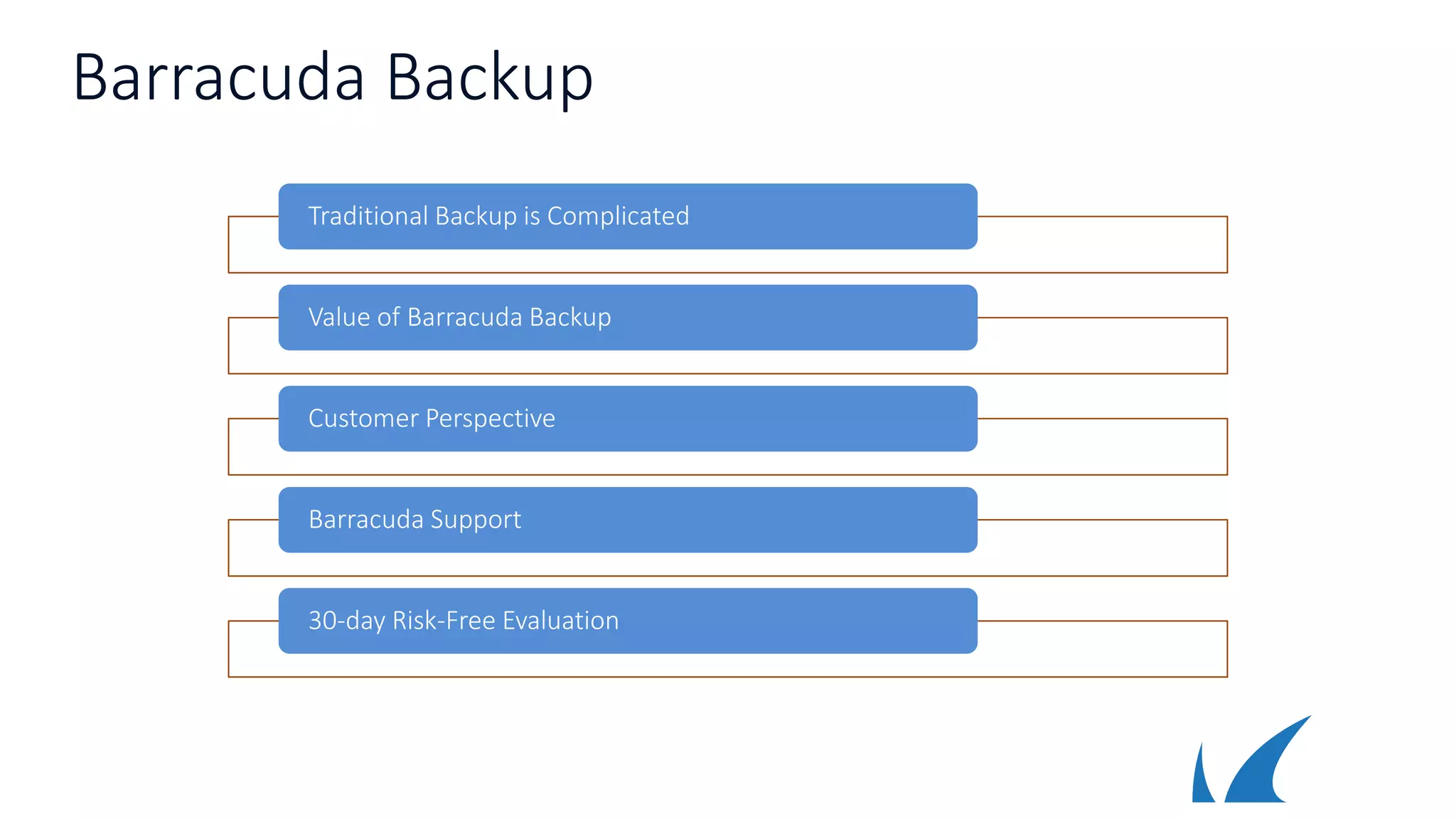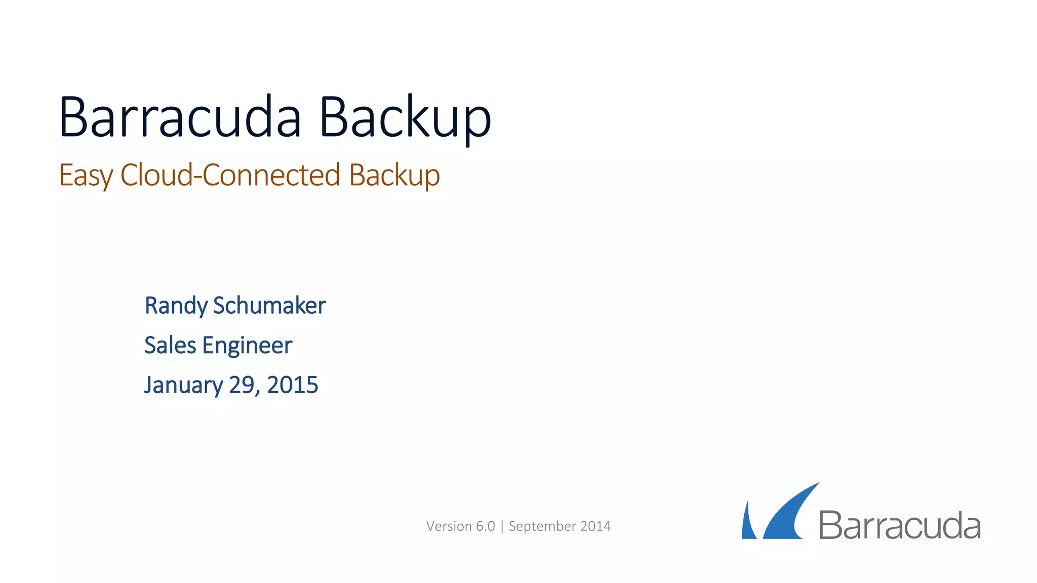 This document summarizes Barracuda Backup, a cloud-connected backup solution. It highlights that Barracuda Backup is easy to buy, install, and manage. It protects environments with flexible deployments for cloud-connected and private backups. Barracuda Backup also saves money with deduplication and compression, provides scalability from 500GB to over 100TB, and has received recognition from customers and industry analysts for its simplicity and support.