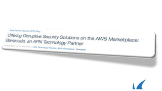 This document summarizes Barracuda's Web Application Firewall solution deployed on Amazon AWS. It provides constant protection from evolving threats when deployed as a reverse proxy in front of applications. It can be deployed in AWS at different sizes depending on throughput needs. The solution offers load balancing, SSL offloading, reporting, and centralized management. It demonstrates how to set up the infrastructure in AWS across availability zones with an Elastic Load Balancer directing traffic to multiple WAF units.