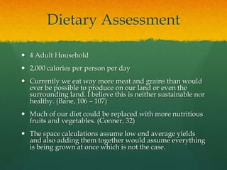 This document discusses the food needs and microclimate conditions of a 4-person household to determine sustainable food production on their land. It provides calculations of the yearly yields and space requirements for various fruits, vegetables, grains and legumes. The microclimate map shows the property receives more sun and heat in front near the road, gets colder and wetter in back, and has frost pockets near the house and woods. Higher light crops would be grown in the full sun middle, while shade tolerant crops can utilize other areas. Legumes can be intercropped throughout.
