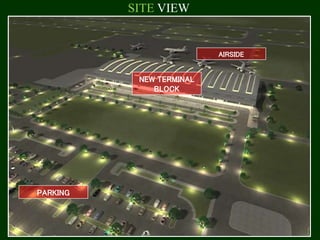 The document outlines the design and accessibility features of a new terminal block at an airport, focusing on infrastructure for passengers with disabilities, including ramps, elevators, and accessible toilets. Key features include accessible routes from parking to departure gates, signage for safety, and facilities designed to assist people with varying disabilities. However, it notes limitations such as the absence of tactile markings and a separate seating area for those with physical challenges.