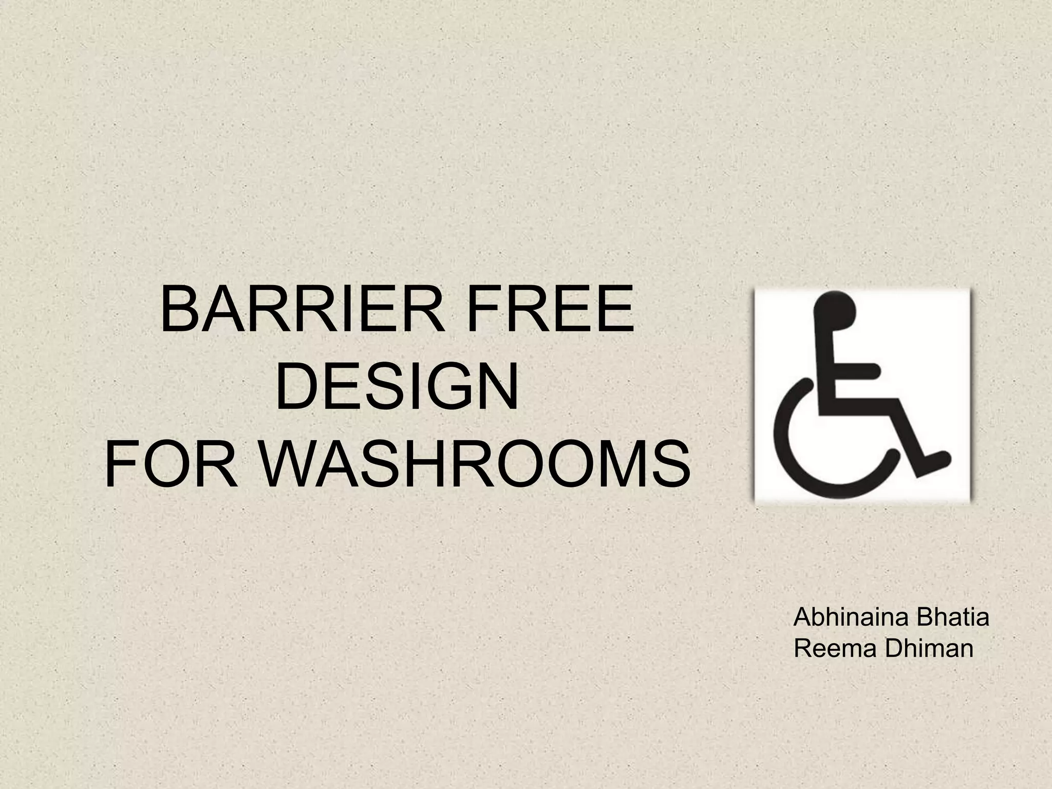 The document provides guidelines for barrier-free accessible washroom design. It outlines dimensions for pathways, wheelchairs, and wheelchair maneuvering spaces. Target groups for accessibility include wheelchair users, those with limited mobility, blind/low vision, and deaf individuals. Guidelines are given for bathroom layouts, shower stalls, grab bars, and fixtures like toilets, sinks, and doors. Dimensions are specified to ensure usability by people of varying abilities. Proper design can make washrooms accessible to the widest range of people.