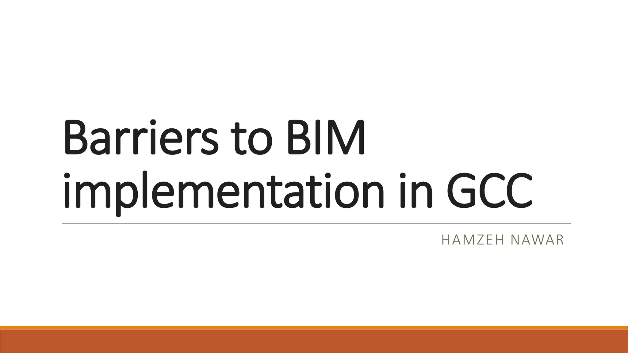 The document discusses barriers to BIM implementation globally and in the GCC region specifically. Some key barriers in GCC include the traditional design-bid-build procurement strategy, unclear employer requirements, and the need for fast project delivery timelines. Adopting BIM also introduces changes to the roles and processes in the AEC industry. The document argues that a unified BIM standard for GCC projects should be adopted, with requirements defined and enforced by engaged employers to fully realize the benefits of BIM.