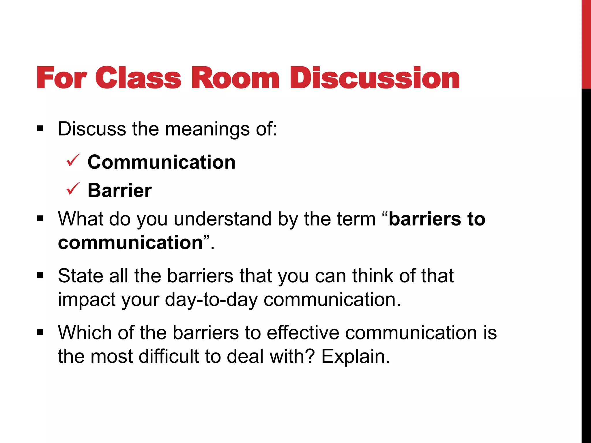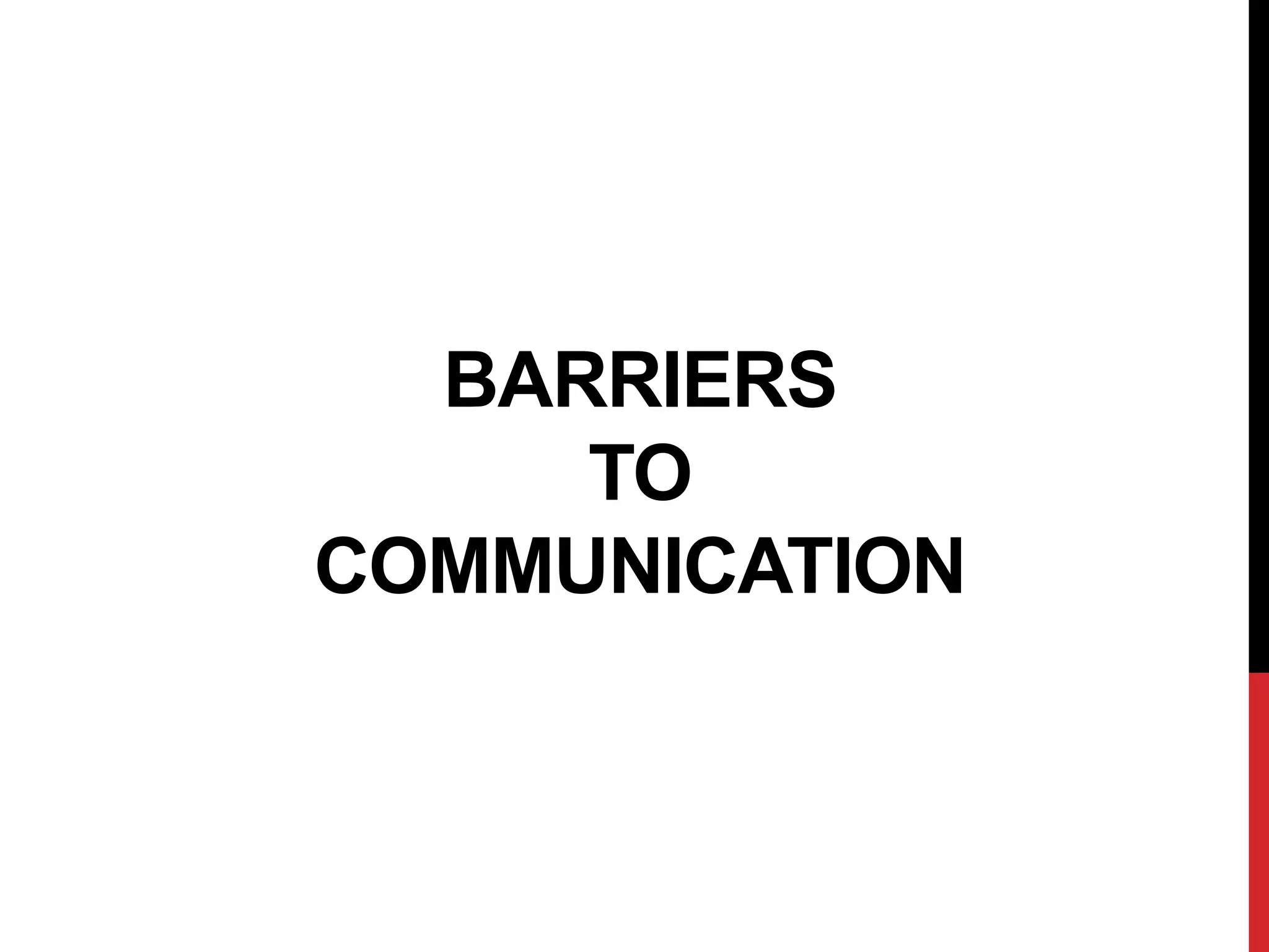Barriers to communication can occur at any point in the communication process and hinder the proper understanding of messages. The document discusses several common barriers including physical barriers like noise; psychological barriers like emotions; semantic barriers due to differences in language; personal barriers such as attitudes; organizational barriers related to hierarchy; social barriers involving relationships; cultural barriers from differing perspectives; and ethical barriers when moral issues are ignored. Overcoming barriers requires minimizing distractions, considering the audience, using clear language, and obtaining feedback to confirm the intended message was received.
