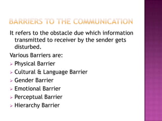 The document discusses various barriers to effective communication, including physical barriers like separate work areas, cultural and language barriers between people from different regions, gender differences in communication styles, emotional barriers like fear and mistrust, perceptual barriers from differing perspectives, and hierarchy barriers between lower and top management. It also provides tips for overcoming these communication barriers such as eliminating differences in perception, using simple language, active listening, having a simple organizational structure, and giving constructive feedback.