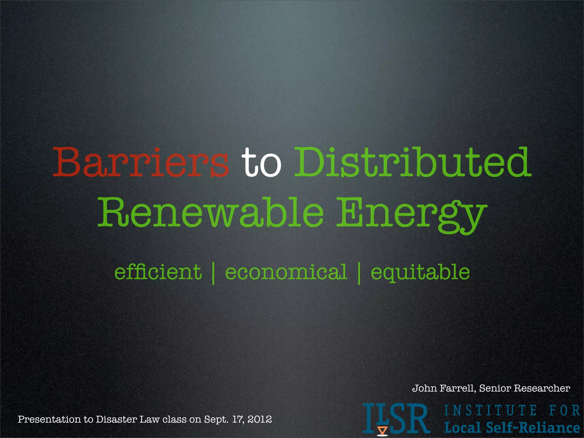The document discusses barriers to the growth of community-owned distributed renewable energy, highlighting issues such as tradition, capital, cash flow, legal restrictions, and utility perspectives. It emphasizes the complexity and costs associated with raising capital for small projects and compares the financial viability of solar projects in the U.S. versus other countries like Germany and Ontario. Additionally, it explores potential solutions, including crowdfunding and regulatory changes to improve access and participation in community solar initiatives.