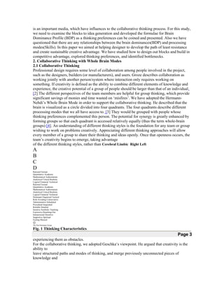 This document discusses barriers to creative idea generation during collaborative problem solving. It aims to identify barriers and develop a formula to determine individuals' Brain Dominance Profiles (BDP), which indicate their thinking preferences. The document reviews how BDP relates to different processing modes and can influence idea generation. It suggests that understanding BDP and using a whole-brain approach can help maximize creative potential and overcome barriers during collaboration.