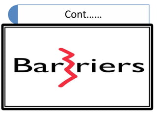 This document discusses barriers to media development in Pakistan. It identifies several types of barriers, including physical, cultural, economic, governmental, technological, and media-related barriers. It provides examples of barriers such as illiteracy, censorship, intimidation of journalists, and lack of training. The document argues that while barriers cannot be completely overcome, stakeholders should focus on ethics, training, and dialogue to utilize media in the interests of society.
