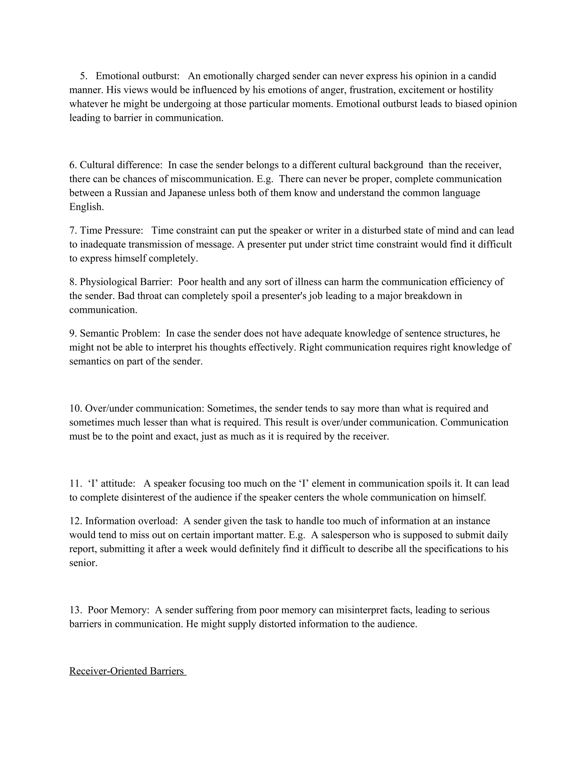 The document outlines various barriers to communication, categorizing them into sender-oriented, receiver-oriented, physical, and organizational barriers. It details specific issues such as inadequate thought processes, poor listening, and noise interference that can hinder effective communication. Additionally, it emphasizes the importance of addressing these barriers through proper ideation, feedback, and the establishment of efficient communication systems to enhance organizational success.
