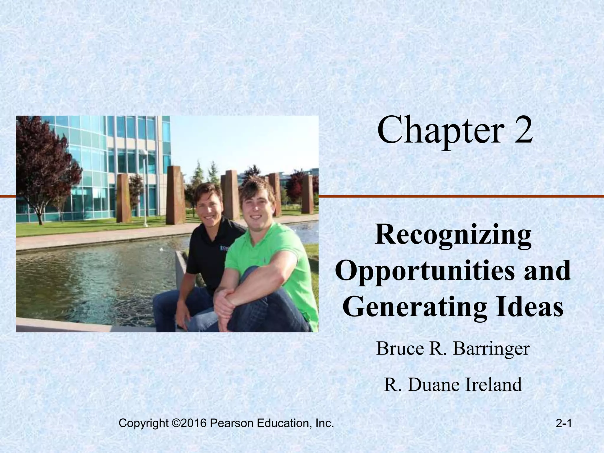 The document discusses techniques for identifying business opportunities and generating new ideas. It describes three main approaches entrepreneurs use to identify opportunities: observing trends in the economy, society, technology and politics; solving problems; and finding gaps in the marketplace. Personal characteristics like prior experience, cognitive abilities, social networks, and creativity can help entrepreneurs recognize opportunities. Common idea generation techniques discussed include brainstorming, focus groups, and research. The chapter aims to explain how entrepreneurs identify opportunities and develop new ideas.