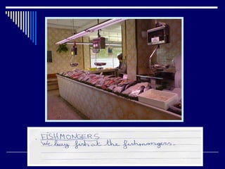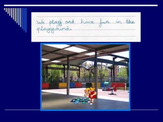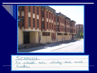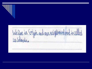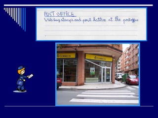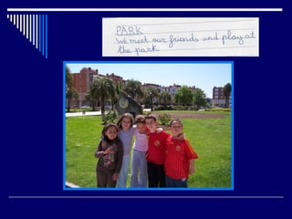 This document is a neighborhood guide created by students in years 1 and 2. It lists important places in the local area such as a supermarket, meat market, bakery, health center, and sports center. The students collaborated on the project, taking photos and writing the guide together.