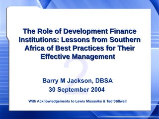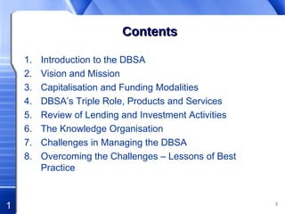 The document discusses the role and operations of the Development Bank of Southern Africa (DBSA). It provides details on: