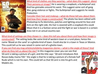The document discusses a magazine cover photo of rapper 50 Cent that shows him taking a picture of another woman. The angle of the magazine story is that 50 Cent is introducing the woman, who is Rick Ross' baby mama, and the photo shows her half-nude. This suggests 50 Cent is interested in women and models. 50 Cent's social media presence promotes his music and films, and links to purchases on iTunes and YouTube. His fan site and audience on platforms like Facebook, Twitter, and Instagram also focus on his music and career.