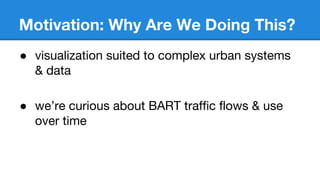 The document details a mid-project presentation on a BART ridership visualization by a group of students, focusing on understanding BART traffic flows from 2006 to the present. It includes design strategies, mockups for interactive features, and an evaluation strategy aimed at transit planners and general public users. Challenges such as layout aesthetics and data complexity are also addressed, with a goal to create an intuitive and informative user experience.