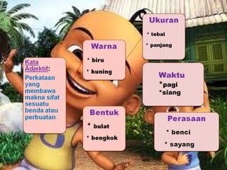 Dokumen ini membahas tentang kata adjektif, termasuk jenis-jenis dan contoh penggunaannya dalam kalimat. Kata adjektif berfungsi untuk menerangkan sifat atau keadaan sesuatu kata nama. Jenis-jenis kata adjektif yang dijelaskan meliputi kata adjektif tunggal, terbitan, ganda, dan majmuk.