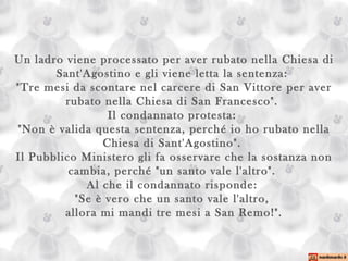 Il documento raccoglie una serie di barzellette e aneddoti umoristici che esplorano situazioni comiche legate a ladri, nomadi e personaggi eccentrici. Ogni racconto mette in risalto il divertimento e la ludicità attraverso malintesi e giochetti di parole. In generale, il testo mira a fornire momenti di allegria e sorrisi ai lettori.