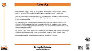 Bas Castings Limited is a UK foundry established in 1973, specializing in high integrity iron and steel castings for industrial applications, with a focus on modern manufacturing techniques and quality management systems. The company has a diverse product range, serving multiple sectors including defense, marine, and renewable energy, and emphasizes cost-effective solutions with extensive post-casting operations. With a workforce of over 200 employees and a turnover of £25 million, Bas Castings maintains rigorous quality control and has received various international accreditations.