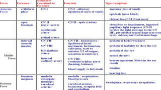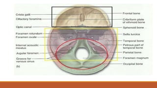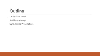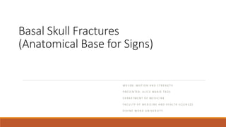 Basal skull fractures occur in the base of the skull and involve fractures of the temporal, occipital, sphenoid, or ethmoid bones. Clinical signs of basal skull fractures include raccoon eyes, rhinorrhea, hearing loss, and mastoid ecchymosis depending on the location of the fracture in the anterior, middle, or posterior fossa. Proper diagnosis involves clinical assessment and identification of signs consistent with a basal skull fracture.