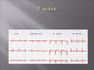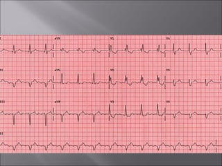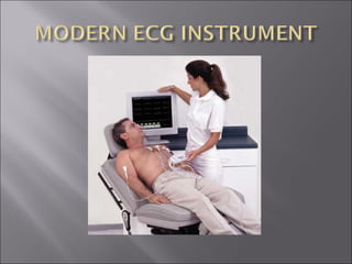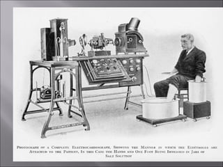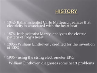 This document provides a history of the electrocardiogram (EKG/ECG) and describes how it is used to evaluate cardiac electrical activity and identify various cardiac conditions. Some key points: